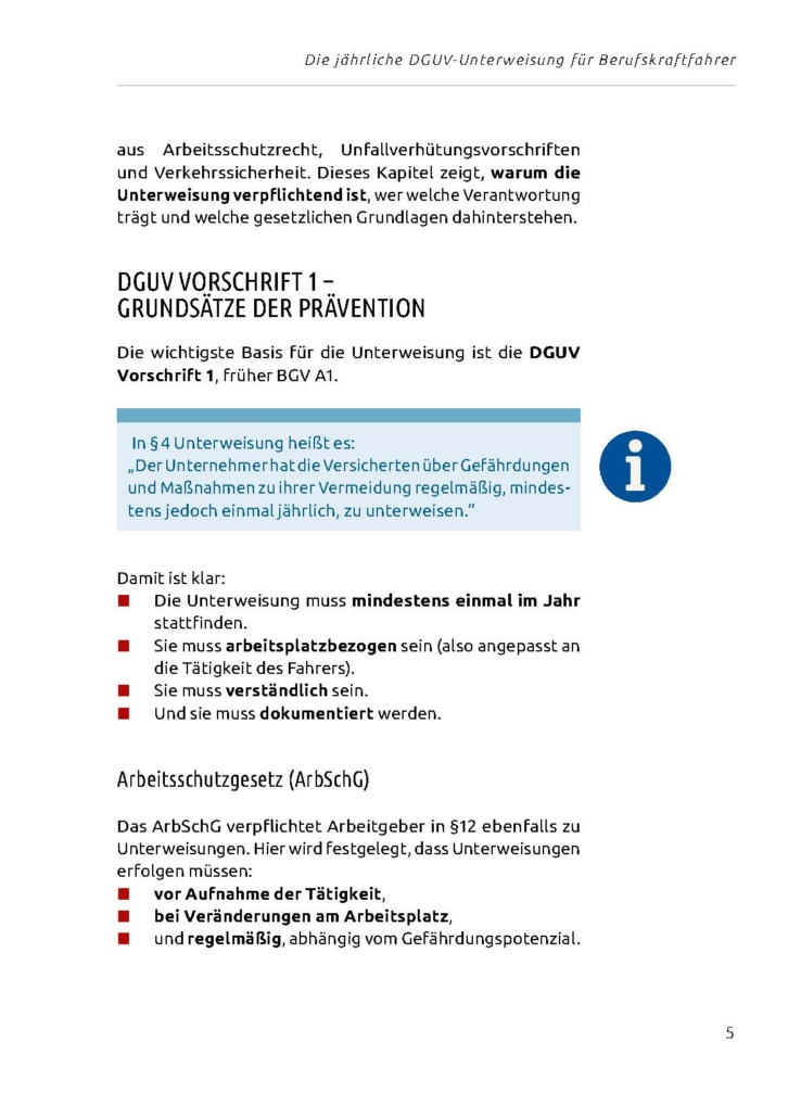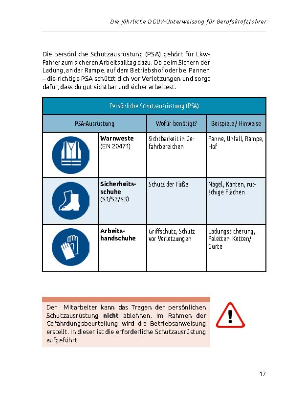 Alle Inhalte sind verständlich, praxisnah und anhand typischer Situationen aus dem Fahreralltag erklärt. Checklisten, Merksätze und Beispiele erleichtern die Umsetzung in der betrieblichen Unterweisung und im täglichen Einsatz.